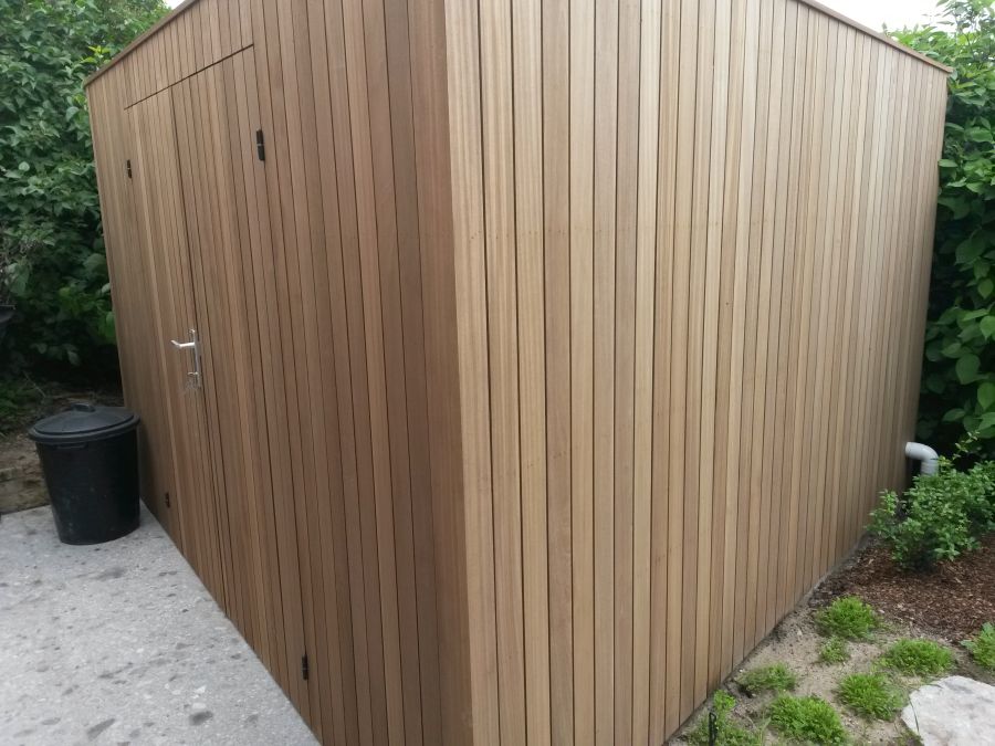 Deze praktische en stijlvolle berging is volledig op maat gemaakt en voorzien van dubbele deuren, waardoor het gemakkelijk toegankelijk is voor het opbergen van fietsen. Het ontwerp is afgewerkt met een plat dak, wat zorgt voor een strakke en moderne uitstraling.