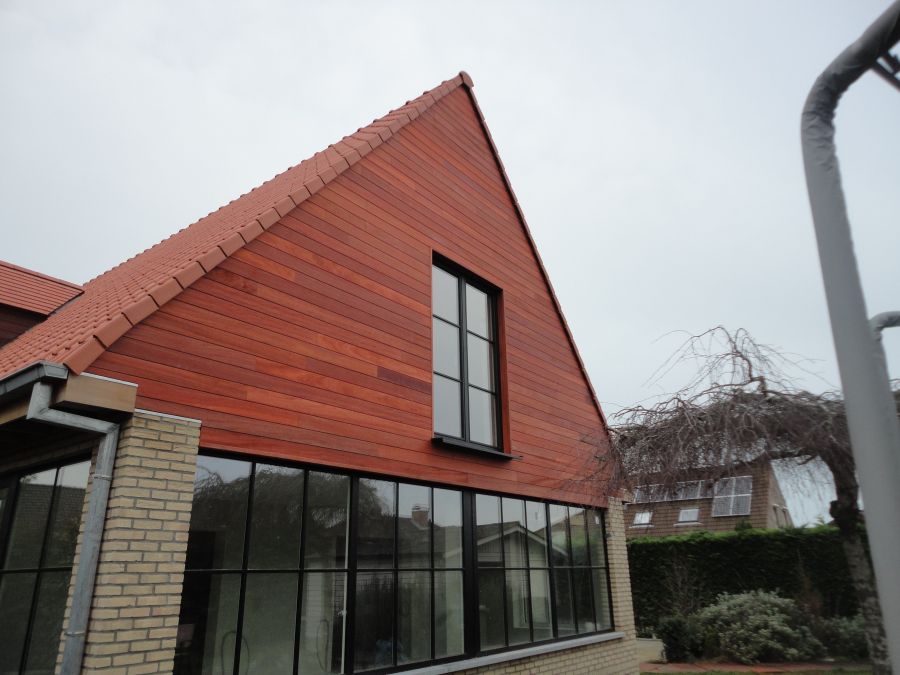 Bij dit project is padouk toegepast in de gevelbekleding, in combinatie met de onderste raampartij. De warme, dieprode tinten van het padoukhout vormen een opvallend en stijlvol contrast met de zwarte kozijnen van de ramen. Deze combinatie zorgt voor een moderne en toch natuurlijke uitstraling, waarbij de levendige kleur van het hout prachtig afsteekt tegen de strakke, donkere lijnen van de ramen. Het resultaat is een visueel aantrekkelijke gevel die zowel karakter als elegantie uitstraalt.