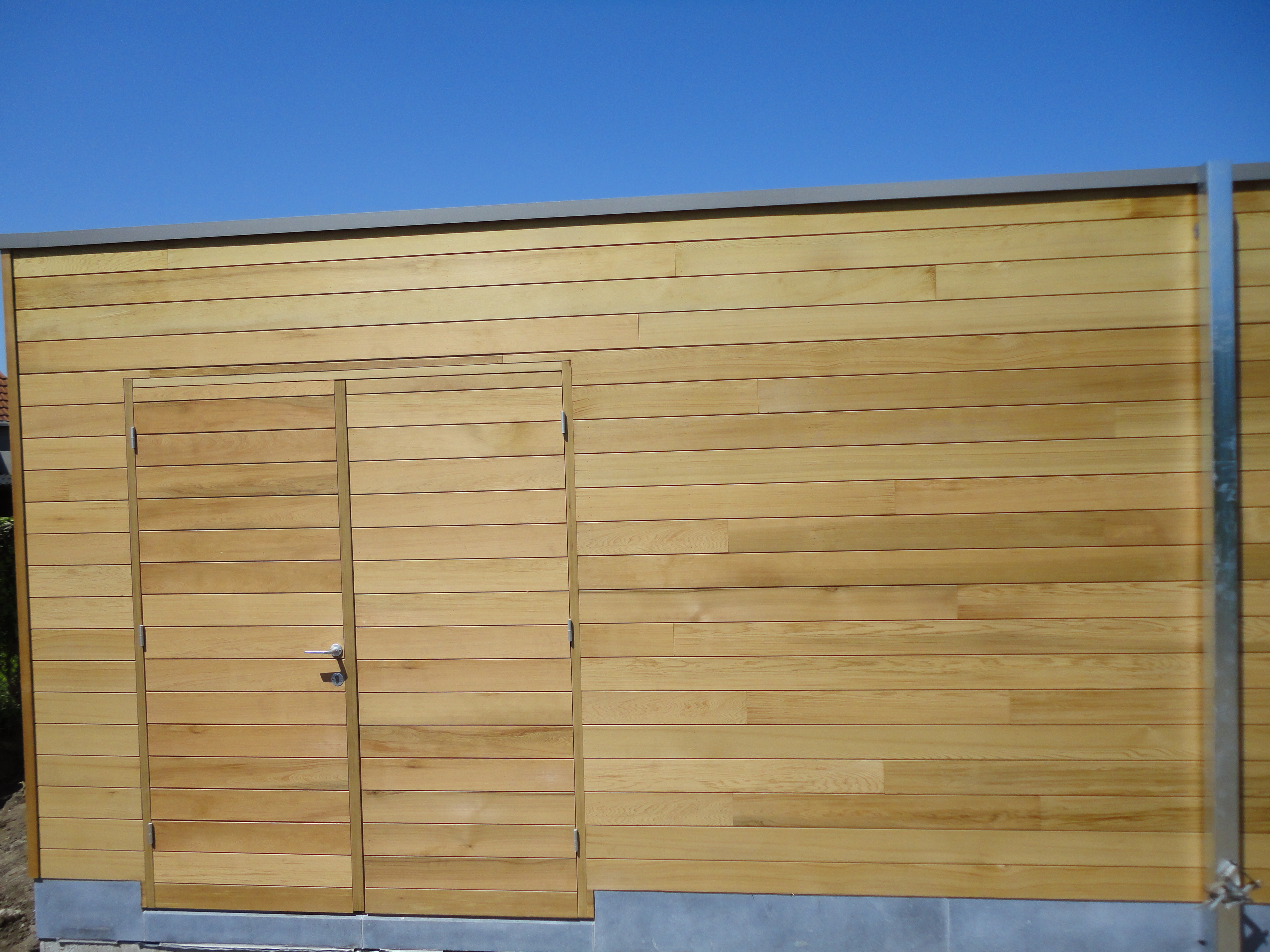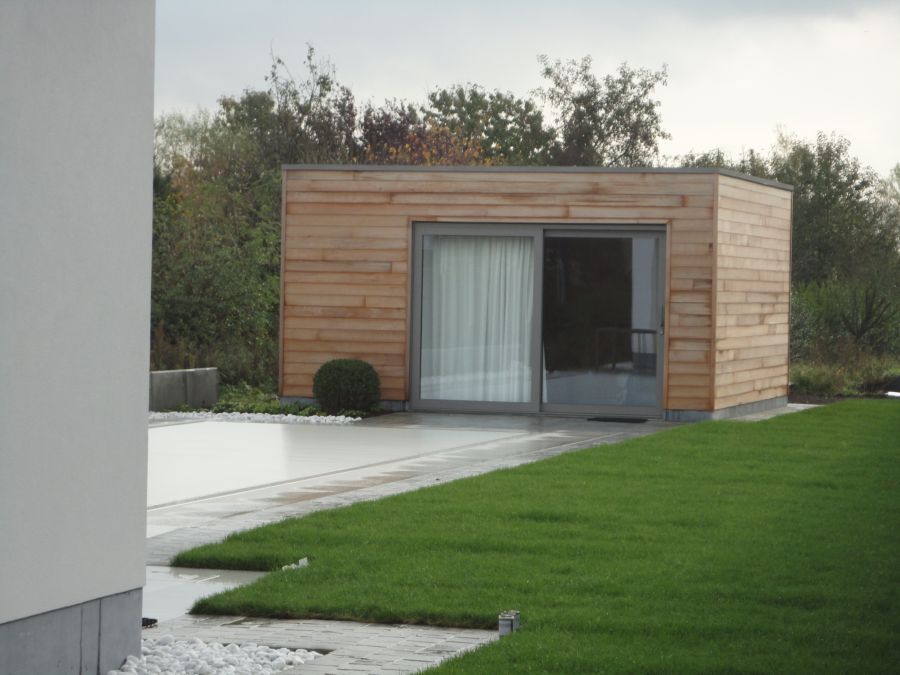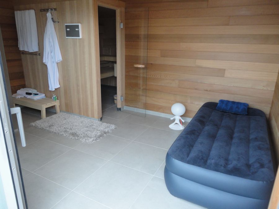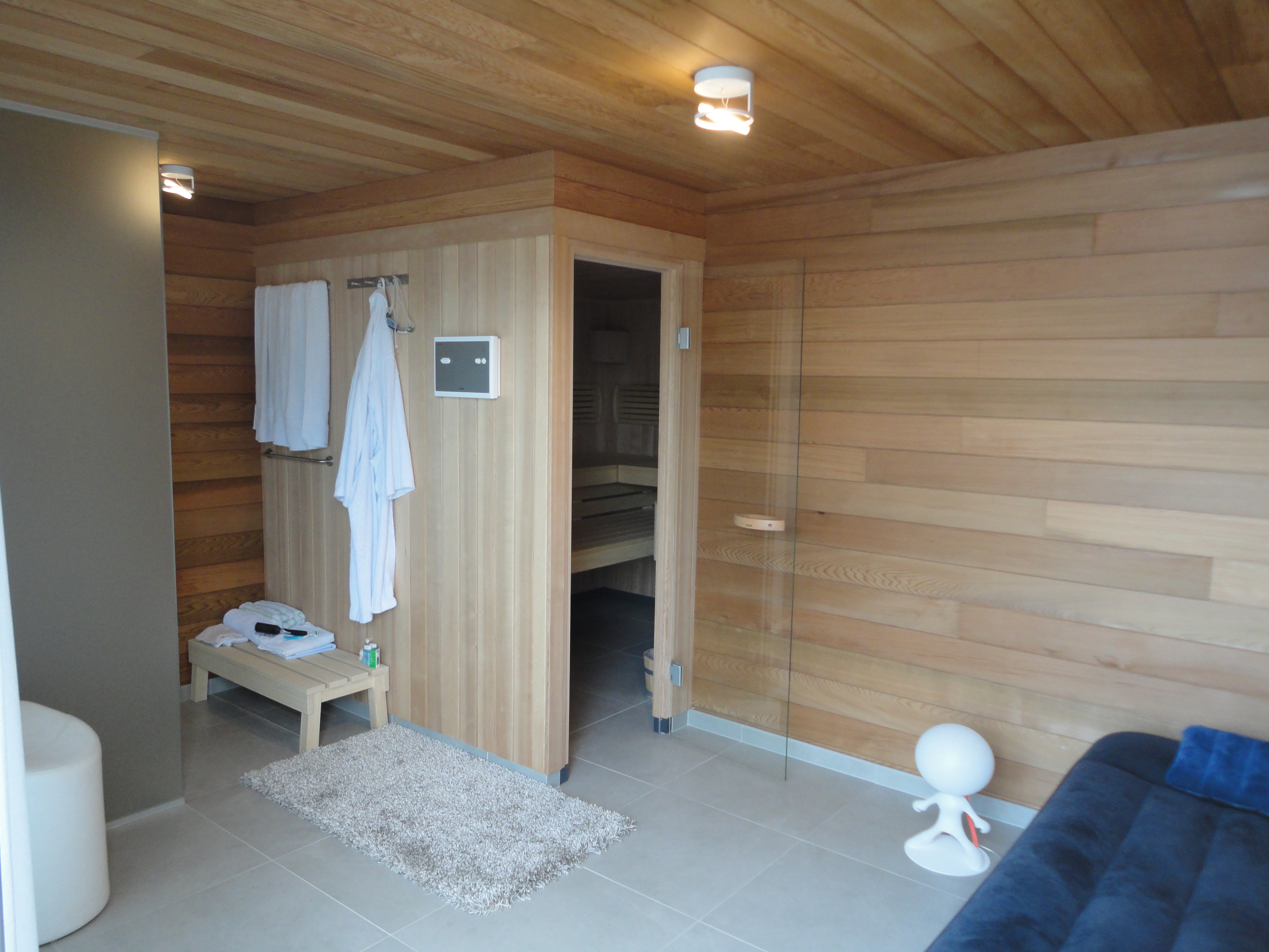 Aangezien de binnenruimte een sauna omvat, is er bewust gekozen om ook de binnenwanden af te werken met cederplanchetten. Deze planchetten zijn behandeld met een speciale olie, die niet alleen de natuurlijke kleur van het hout behoudt, maar ook een extra beschermingslaag biedt tegen vocht en slijtage. Hierdoor blijft de saunaruimte niet alleen functioneel, maar ook visueel aantrekkelijk en duurzaam. Het gebruik van cederhout in zowel het interieur als exterieur creëert een naadloze overgang en draagt bij aan een warme, natuurlijke sfeer in de gehele ruimte.