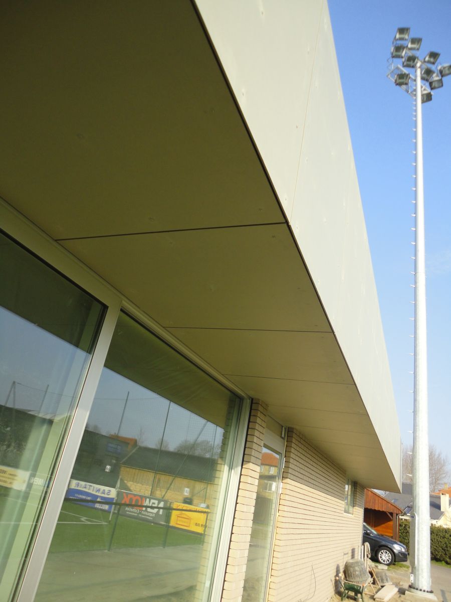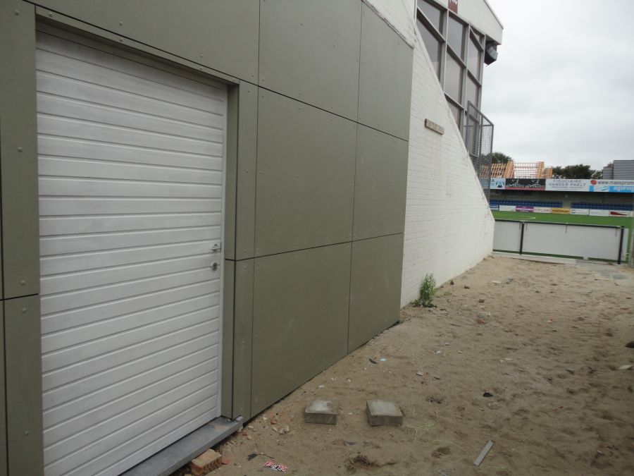 Deze tribune is voorzien van stevige luifels, die niet alleen functioneel zijn, maar ook een esthetische meerwaarde bieden. Bij de constructie van deze luifels is allereerst een robuust houten frame getimmerd, dat vervolgens is geïsoleerd om optimale bescherming te bieden tegen weersinvloeden. Voor de afwerking zijn hoogwaardige Eternit-platen gebruikt, een materiaal dat bekendstaat om zijn duurzaamheid en onderhoudsgemak.