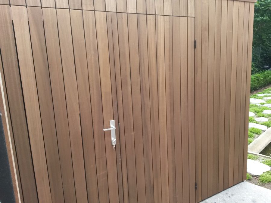 Deze praktische en stijlvolle berging is volledig op maat gemaakt en voorzien van dubbele deuren, waardoor het gemakkelijk toegankelijk is voor het opbergen van fietsen. Het ontwerp is afgewerkt met een plat dak, wat zorgt voor een strakke en moderne uitstraling.