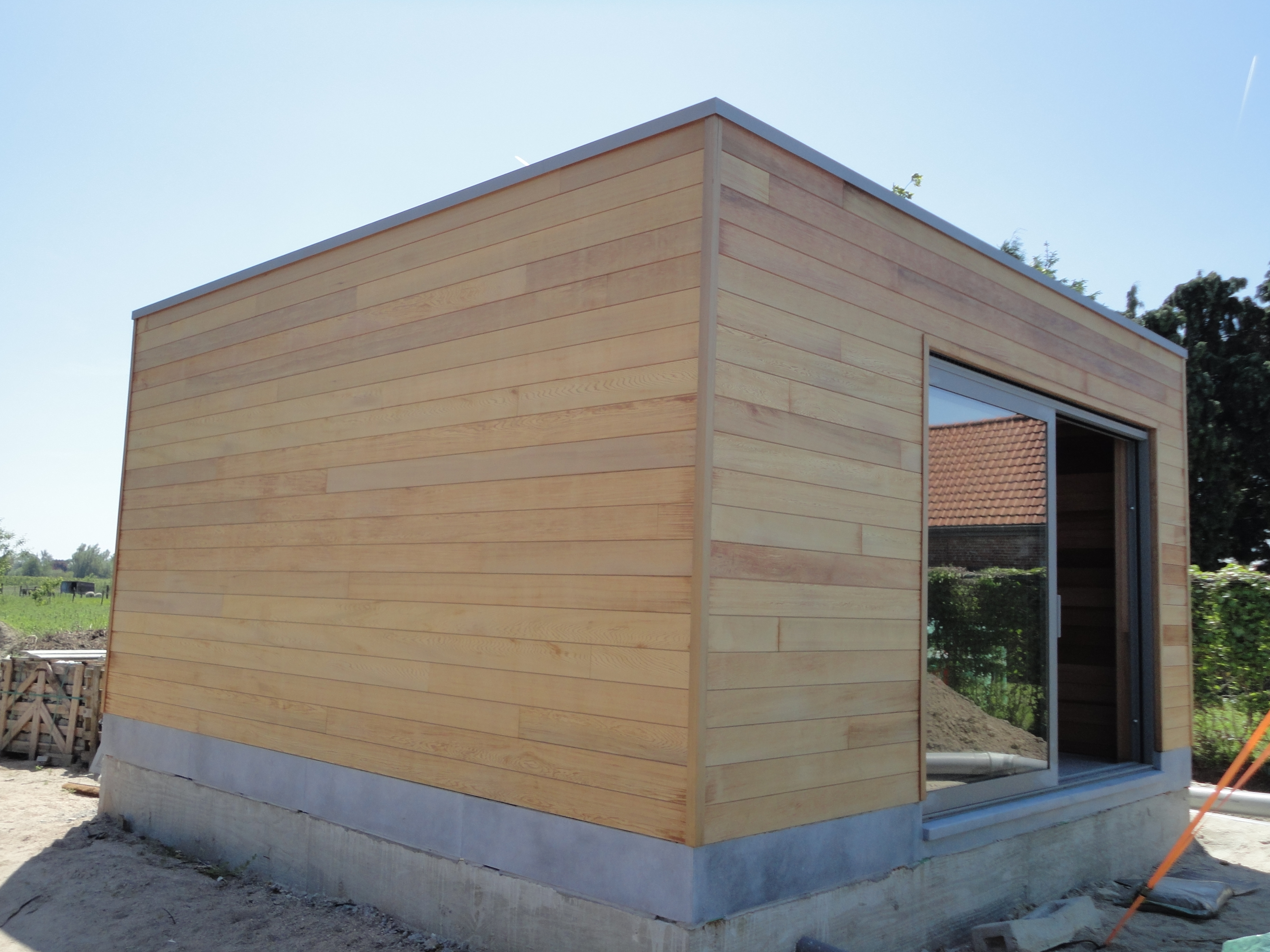 Aangezien de binnenruimte een sauna omvat, is er bewust gekozen om ook de binnenwanden af te werken met cederplanchetten. Deze planchetten zijn behandeld met een speciale olie, die niet alleen de natuurlijke kleur van het hout behoudt, maar ook een extra beschermingslaag biedt tegen vocht en slijtage. Hierdoor blijft de saunaruimte niet alleen functioneel, maar ook visueel aantrekkelijk en duurzaam. Het gebruik van cederhout in zowel het interieur als exterieur creëert een naadloze overgang en draagt bij aan een warme, natuurlijke sfeer in de gehele ruimte.